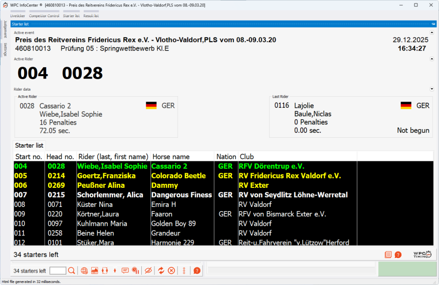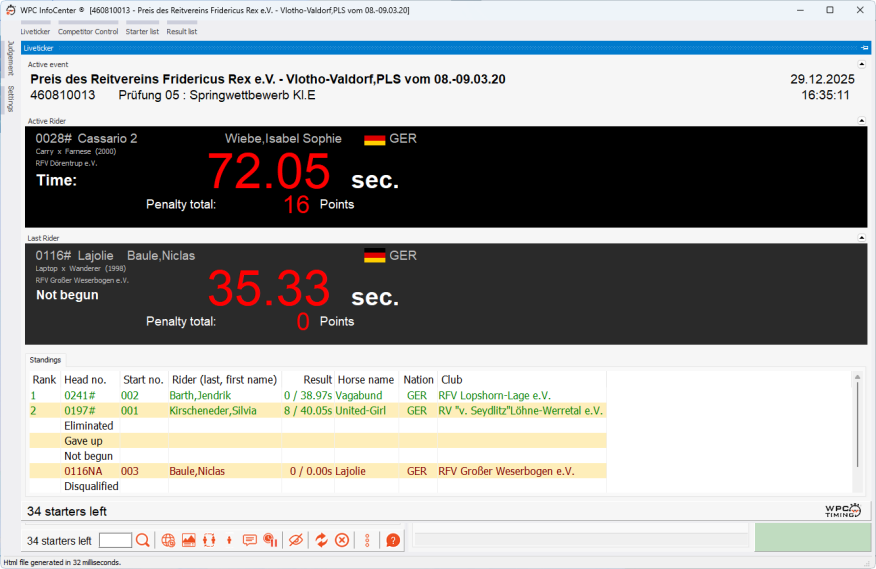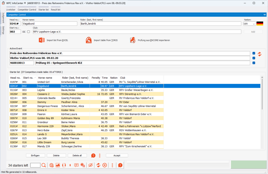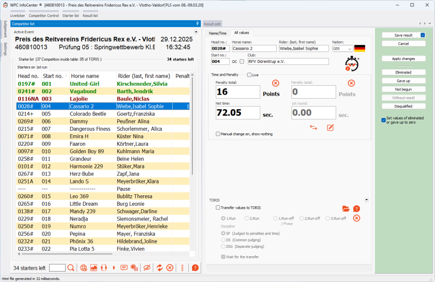 Das ist der Hauptbereich vom WPC InfoCenter. Die importierte Teilnehmerliste wird hier angezeigt, sowie die Ergebnisbearbeitung mit diversen Möglichkeiten für den manuelle Ergriff in ds Ranking.