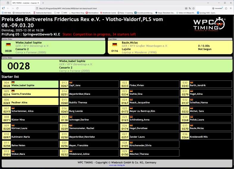Ein Klick in die importierte Teilnehmerliste und am Abreiteplatz- bzw. im Startbereicht erscheint automatische die aktuelle Startreihenfolge. Eine intregierte Ergebnisliste kann zusätzlich zur Info aktiviert werden.
